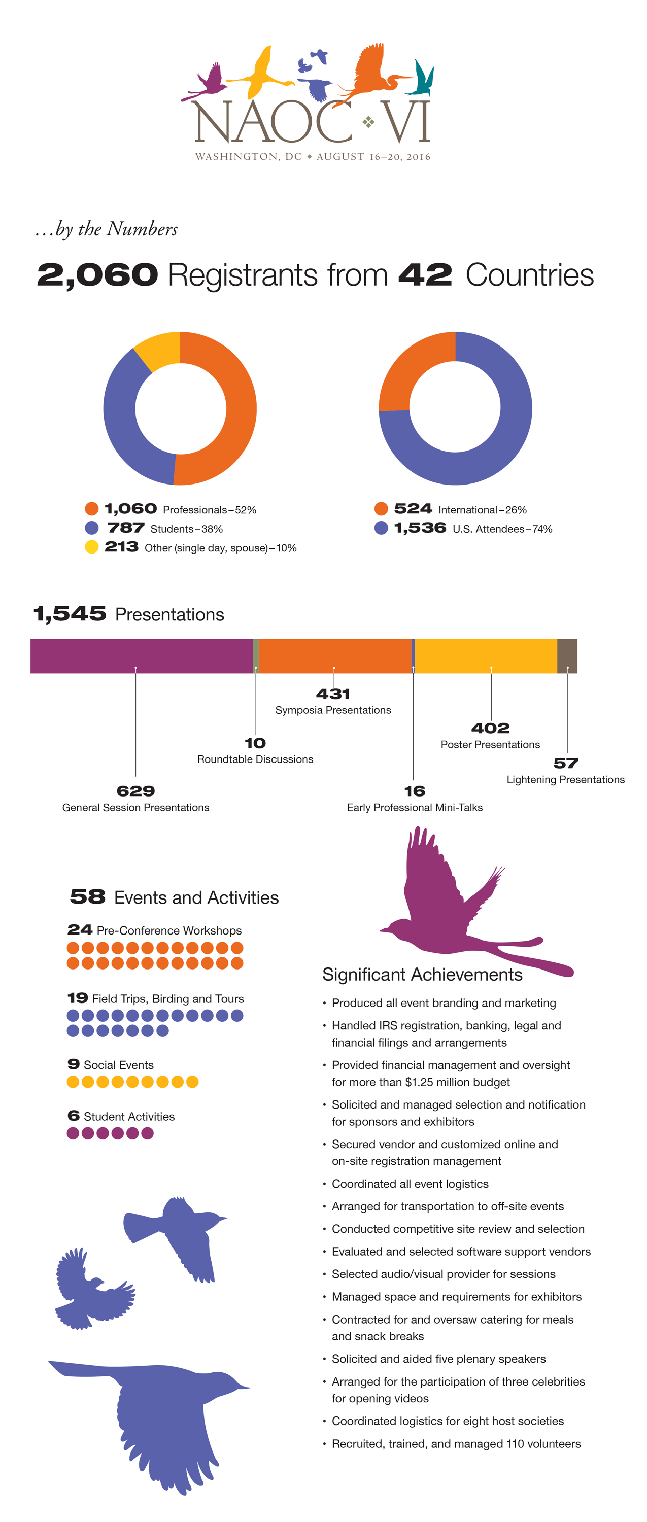 The North American Ornithological Conference occurs once every four years, and it needed to be attended by the greatest number of people from the most countries, and with more abstract submissions, tracks, and educational sessions than ever before. And not just people, but students especially, because they were paramount to the clients’ definition of success and the vitality of the future of the field. So record-setting participation from professionals and students alike was a necessity.